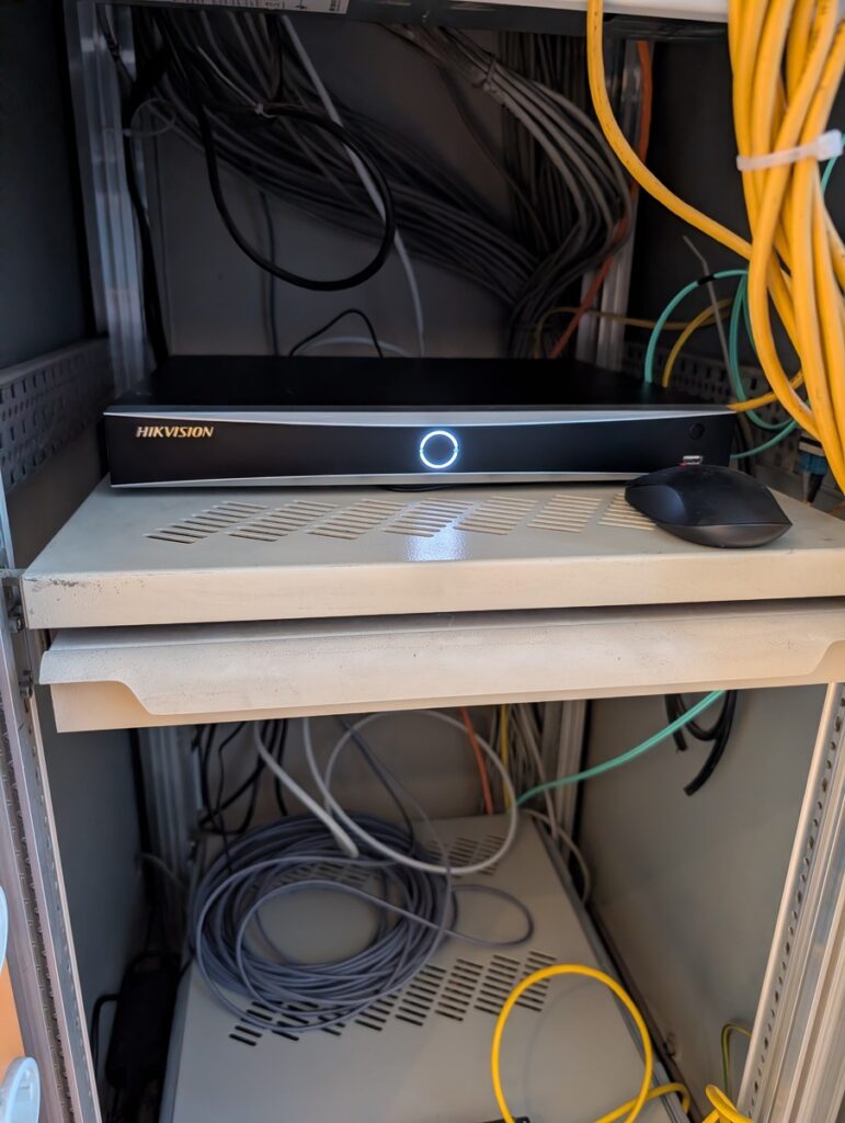 Im Zentrum der Installation steht eine Hikvision‑Recorder-/Serverlösung, die im Technikbereich montiert wurde. Ein geordneter Rack‑Aufbau mit sauber geführten Leitungen ist im Betrieb ein klarer Vorteil: