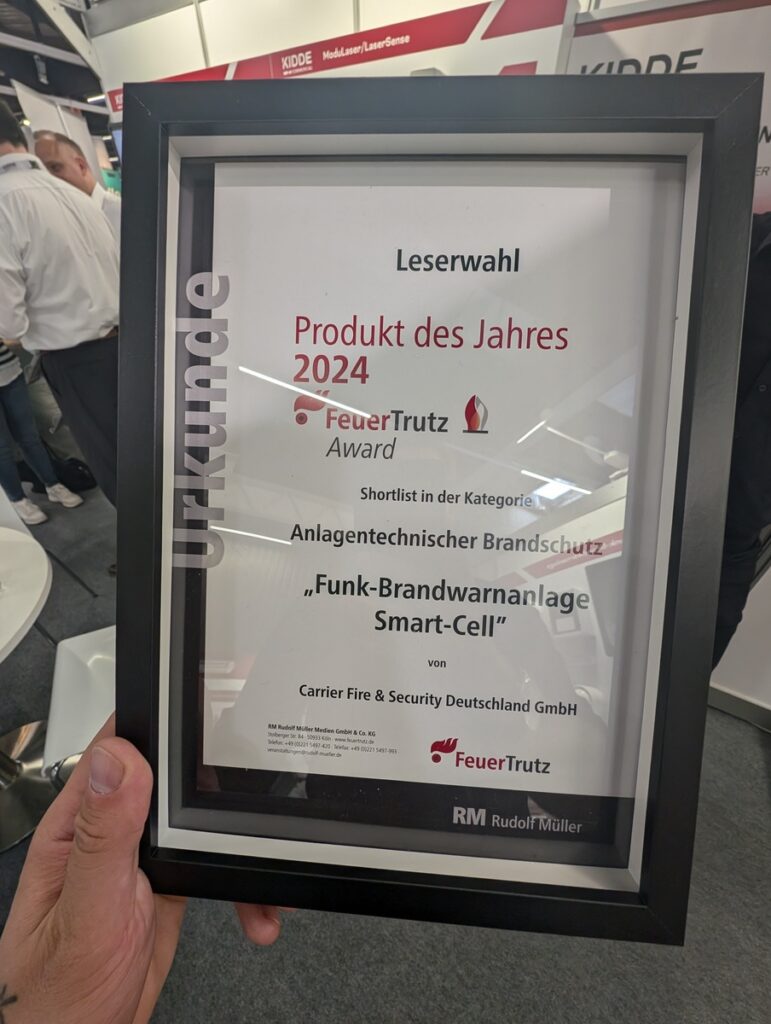 Auf den aktuellen Bildern von der Fachmesse ist eine Urkunde zur Leserwahl „Produkt des Jahres 2024“ im Rahmen des FeuerTrutz Award zu sehen. In der Kategorie Anlagentechnischer Brandschutz wurde die „Funk-Brandwarnanlage Smart-Cell“ (Carrier Fire & Security Deutschland GmbH / KIDDE) für die Shortlist ausgewählt. Solche Nominierungen sind für Planer, Betreiber und Errichter ein interessanter Indikator dafür, welche Lösungen in der Branche gerade besonders viel Aufmerksamkeit erhalten – insbesondere dann, wenn es um praktische Umsetzbarkeit, Nachrüstbarkeit und Betriebssicherheit geht.